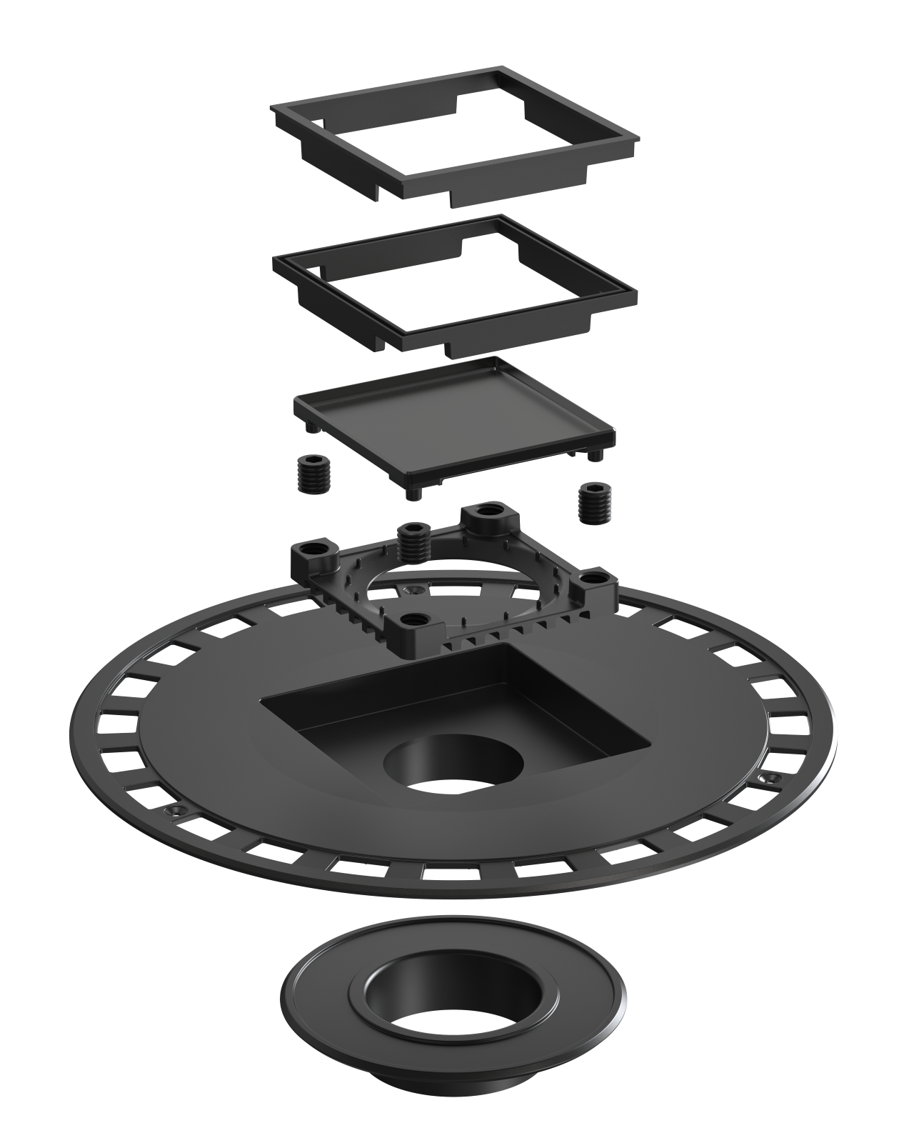 Installer-optimized features include a grate base integrated with height adjustment screws to ensure accurate tile alignment with minimal effort, while texture-molded surfaces promote strong adhesion and mechanical bond with HYDRO BAN waterproofing. The grate-adjusting base accepts one-piece point drain grate designs, allowing drain grate styles and finishes to be changed without modifying the drain assembly.